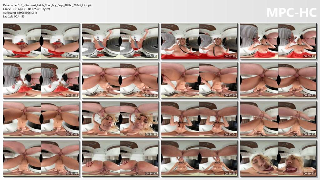 Rope around your hands and legs, unable to move and seeing Nina come over you, only a skirt covering her shaved pussy, with her blonde, untied hair and big tits bouncing as she walks. She can do whatever she wants to you now, cuck! She wants to have a threesome with two guys so that you can watch and have her squirt in the end. As she starts kissing the guys when they arrive, she gets on her knees and sucks them both. They take turns fucking her ass and throat-fucking her, then cum in her big ass, making a nice anal creampie, and her mouth, filling it with a lot of warm cum. Open your mouth in the end for a surprise!VRoomed - Nina Santi - Fetch Your Toy, Boys (Original 8K)
