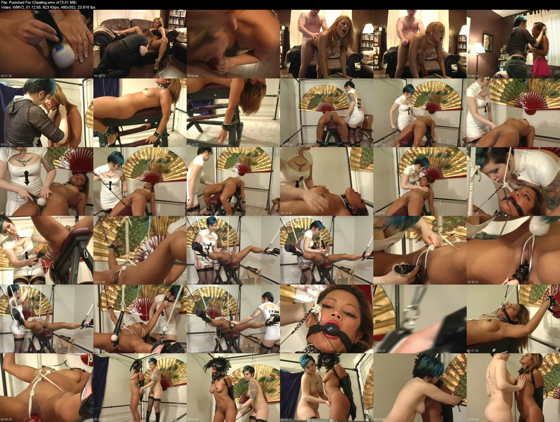Punished For CheatingFetish bitch, Miss Lain, comes home from work early and catches bondage slut, Maxine X, fucking her boyfriend! But Lain has the last laugh as she ties Maxine X to her spanking bench. Then she ties her to the cage in a spread-eagle suspension tie. Maxine X is whipped, spanked, gagged, humiliated and compelled to endure a pussy assault by the FUCKSAW at 1,000 stokes per minute! Later, Lain makes Maxine X bring her to orgasm with oral servitude while bound in a leather strappado. Finally, Maxine X is rewarded for her obedience with a compelled orgasm while in bondage. Has she learned her lesson not to fuck with Lain's boyfriend? Find out for yourself in this hot bondage, compelled orgasm, girl/girl BDSM fetish movie.